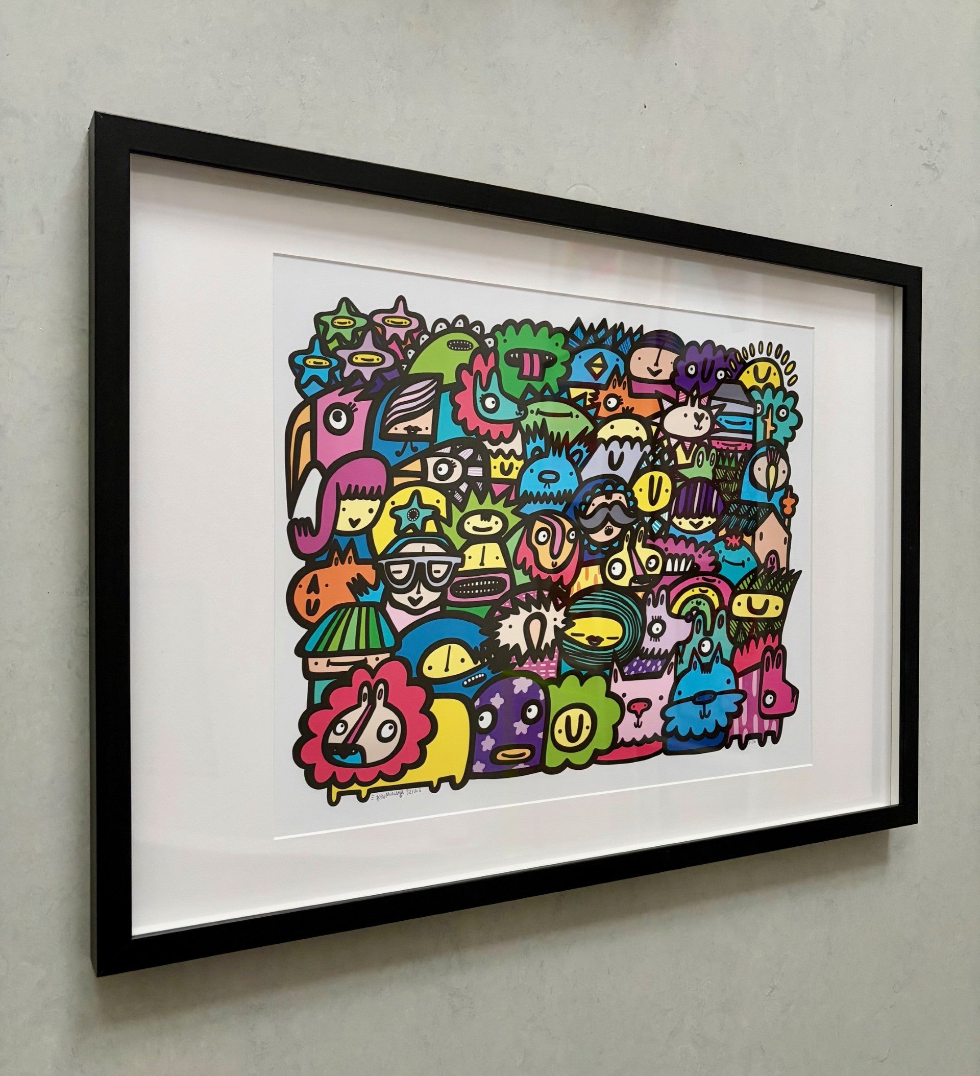 Kev Munday creëert kleurrijke, utopische werelden en nodigt de kijker uit om er enige tijd in te vertoeven. Geïnspireerd door mensen kijken en het alledaagse, overdrijft Kev en viert hij het gewone en streeft hij ernaar dat zijn kunst voor alle leeftijden aantrekkelijk is.