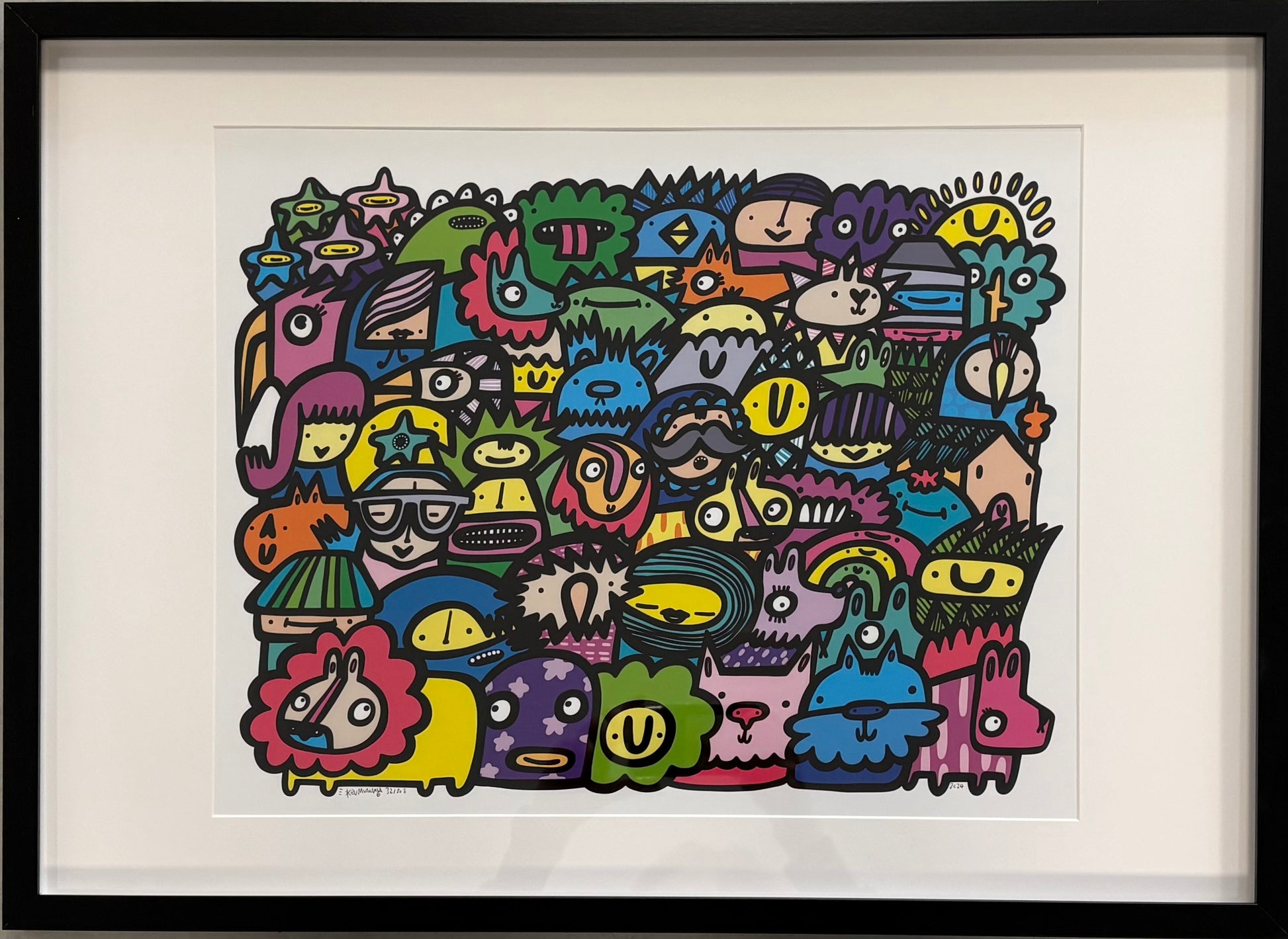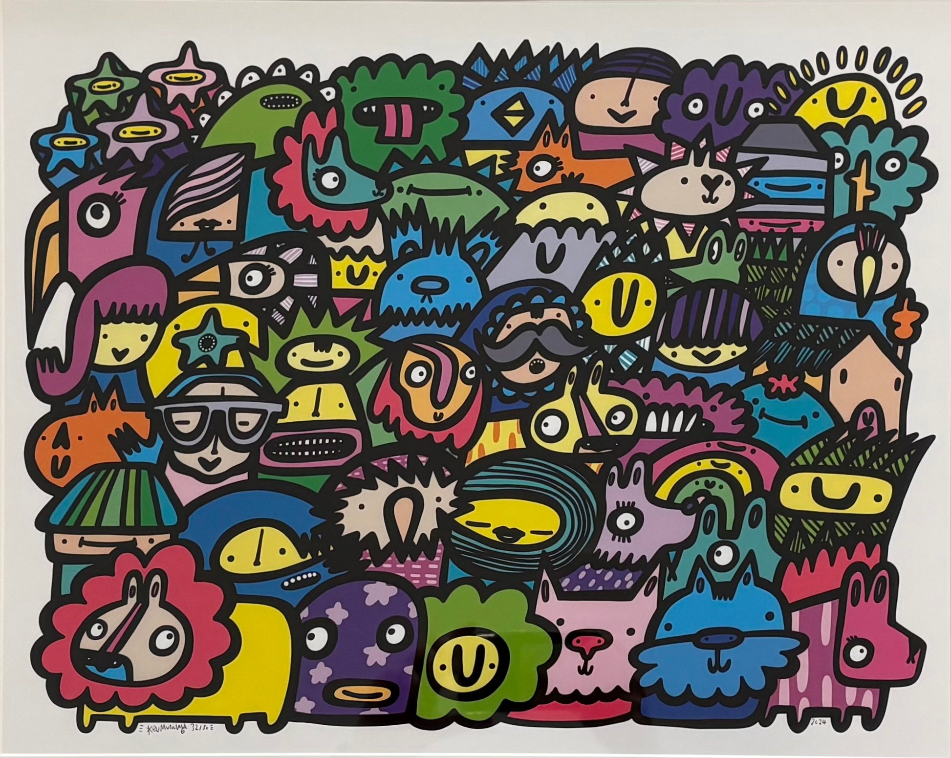 Kev Munday creëert kleurrijke, utopische werelden en nodigt de kijker uit om er enige tijd in te vertoeven. Geïnspireerd door mensen kijken en het alledaagse, overdrijft Kev en viert hij het gewone en streeft hij ernaar dat zijn kunst voor alle leeftijden aantrekkelijk is. In de traditie van artiesten zoals Hieronymus Bosch kunnen de schilderijen van Munday gelezen worden als een wimmelbilderbuch (Duits, letterlijk 'overvloedig prentenboek'), dat scènes uitbeeldt die rijk gedetailleerd zijn met mensen, dieren, wezens en objecten die wachten om ontdekt en geïnterpreteerd te worden door de kijker. Met vette lijnen en blokkleuren creëert de levendigheid van Munday’s stijl een boeiende visuele ervaring. Zijn iconische groepsschilderijen tonen een zee van unieke individuen, wat een eerbetoon is aan de schoonheid van diversiteit. Elk portret wordt evenveel gewaardeerd; samen vormen ze een opvallend beeld van gemeenschap dat meer is dan de som der delen.