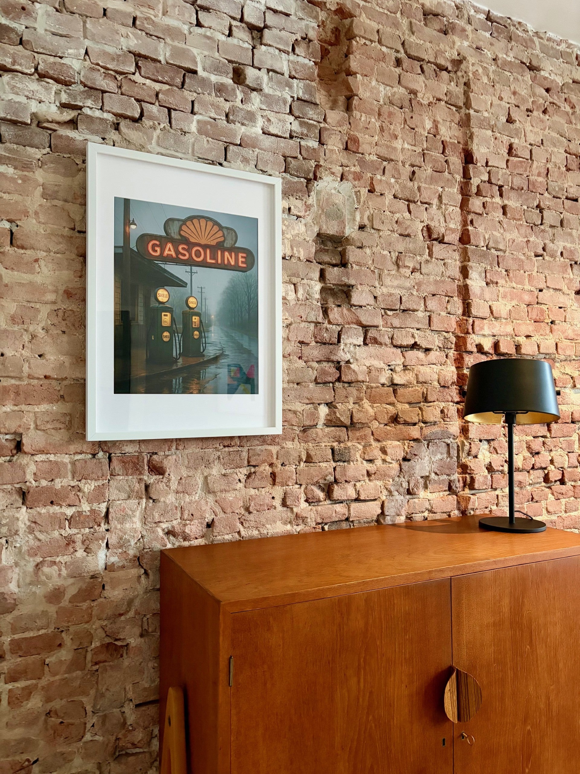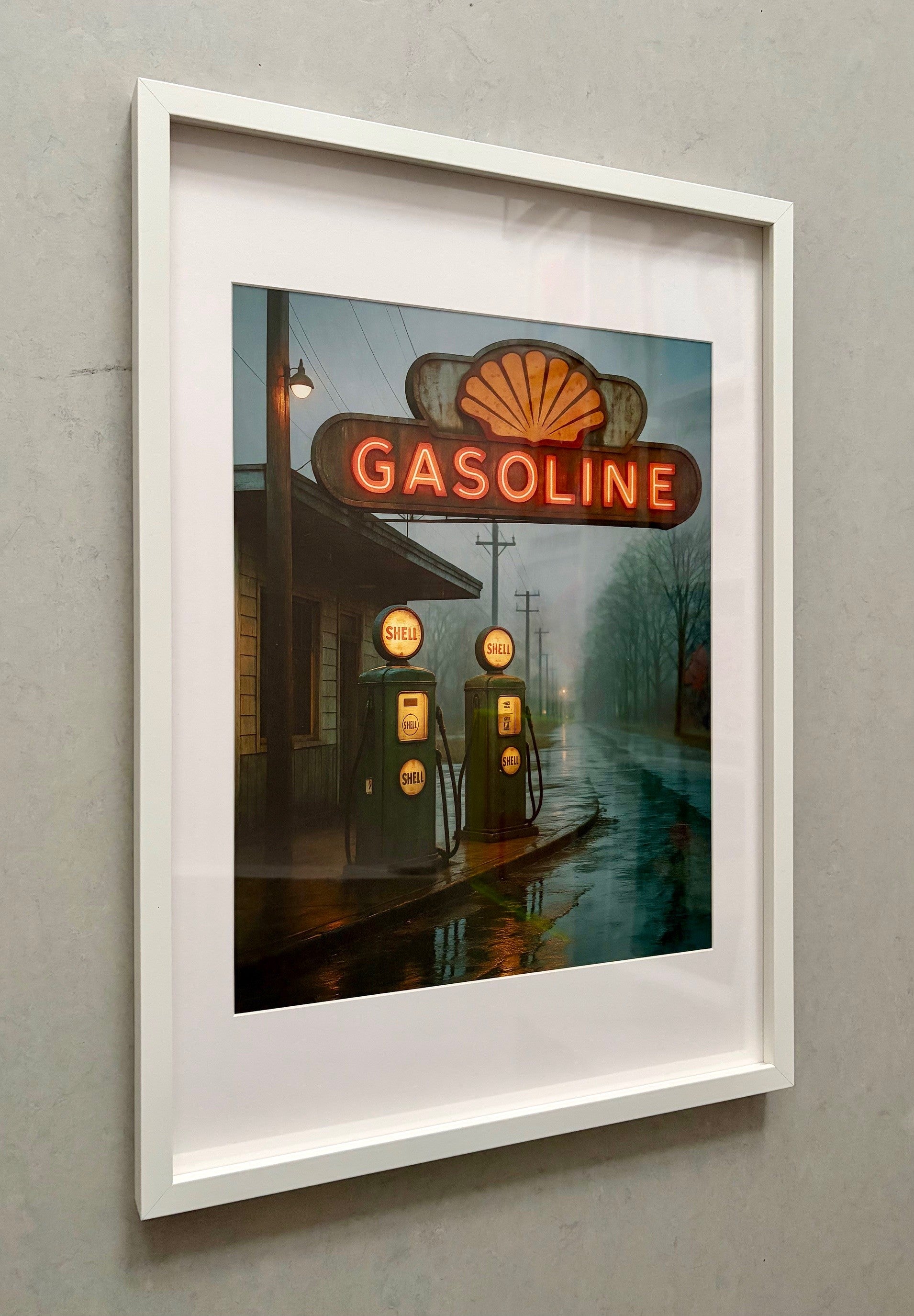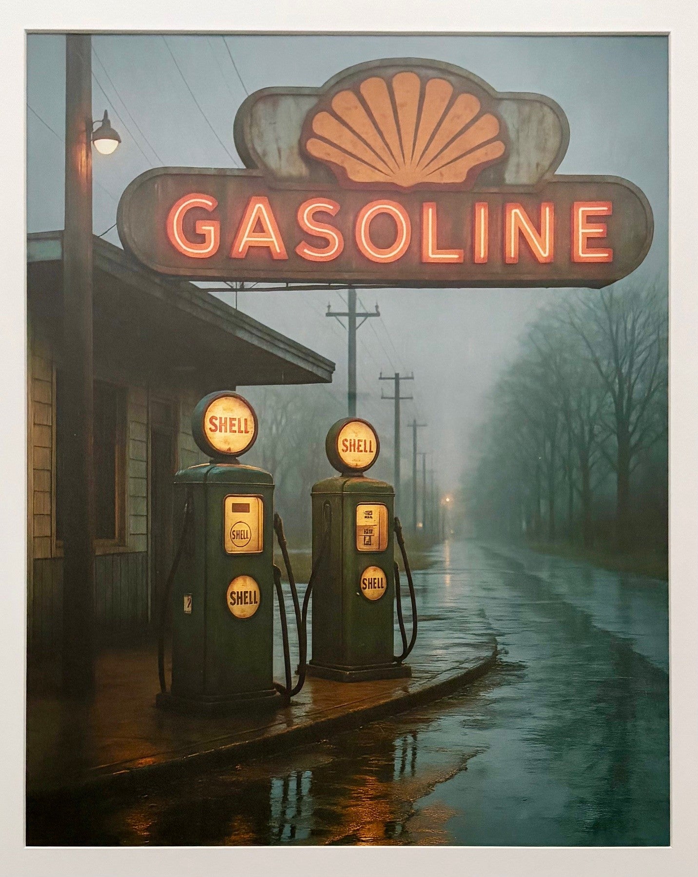 Tristan Mottier is een Franse kunstenaar. Op deze beklemmende, filmische foto ontdekken we een vergeten Shell-tankstation, bevroren in een lichte regen, aan een verlaten weg. De roodoranje neonlichten doorboren de vochtige schemering en de reflecties op het doorweekte asfalt creëren een bijna surrealistische sfeer. Het beeld, zowel rauw als poëtisch, legt een tijdperk vast dat zweeft tussen verleden en stilte. We voelen de eenzaamheid, de nostalgie en de schoonheid van een vergeten wereld.